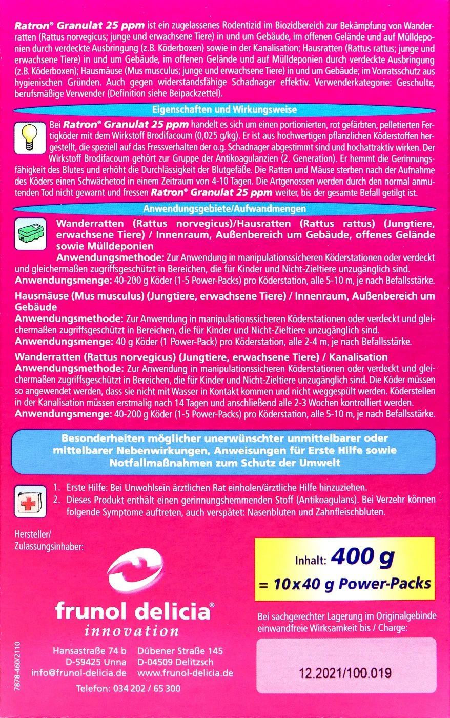 Aus die Maus. Denn mit den Power Packs von Ratron ist dir die Ratte einfach total latte. Das pinke Granulat ist bereits vorportioniert, sodass du sie nur noch in eine Köderbox streuen musst. Der Köder besteht aus hochwertigen pflanzlichen Stoffen, die die Ratten zum Fressen gern haben. Ihre Freunde gehen nichtsahnend von einem Schwächetod aus und naschen mit der Zeit ebenfalls von dieser geballten Power. Deine einzige Aufgabe ist es, für Nachschub zu sorgen.
